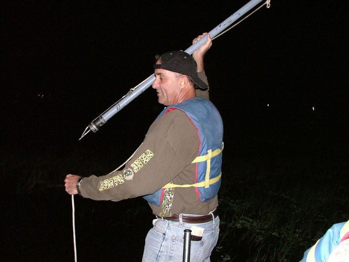 Because of the habitat, gator hunting is totally different from any other type of hunting. The key to harvesting a gator is locating him & attaching a restraining line. The best, anywhere method of attaching a workable restraining line is a HARPOON and should be considered MANDATORY for gators over 7'. While a bow rigged for fish works well in open water, they don’t function so great with a small line in vegetation, timber, brush or other obstructions. Remember; if you shaft a gator, you need to harvest him regardless of where he runs! With a harpoon rigged with the line through the pole, you may harpoon any size gator in any circumstance and be reasonably able to retrieve him. If you shaft a 8+ gator with your bow, you more than likely will have to harpoon him to gain control. Then again, if he’s only 6', the bow line will work.